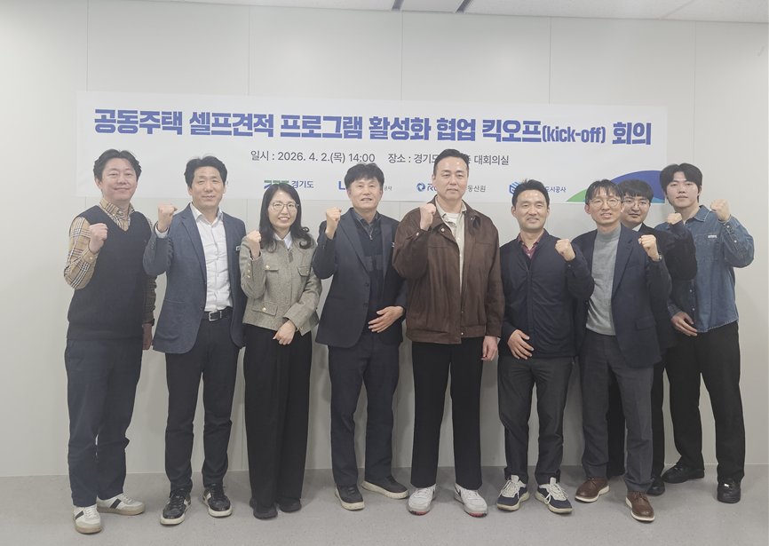 경기도는 4월 2일 경기도청에서 중앙공동주택관리지원센터(한국토지주택공사/LH), K-apt(한국부동산원), 경기주택도시공사(GH) 실무자들이 참석한 가운데 ‘공동주택 셀프견적 프로그램 활성화 협업 킥오프(Kick-off) 회의’를 개최했다.